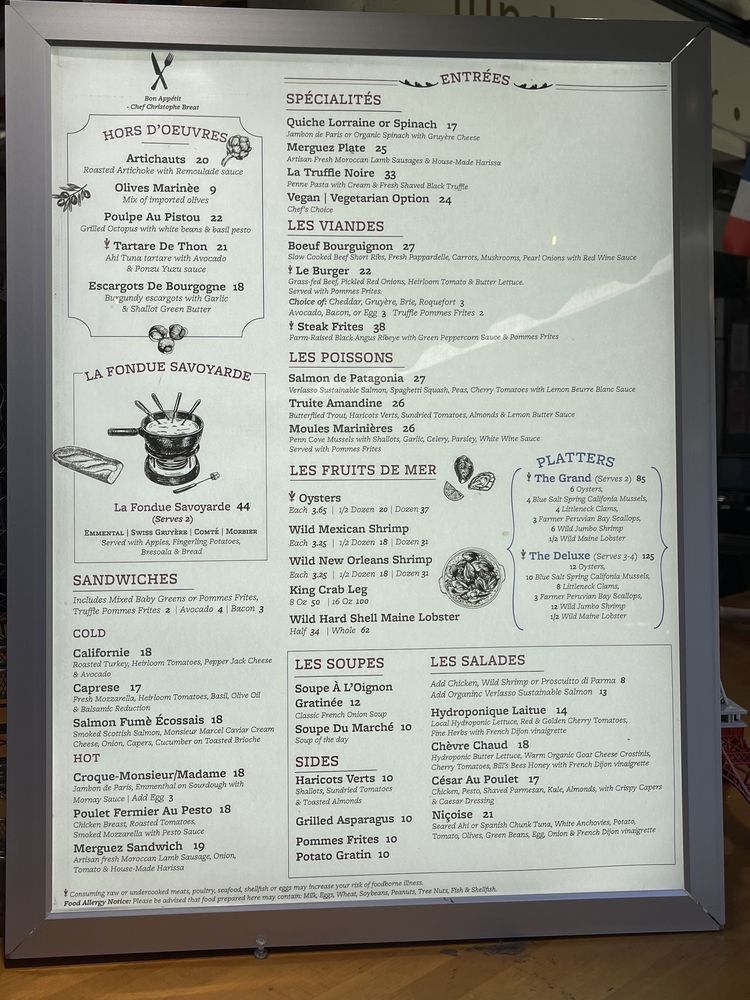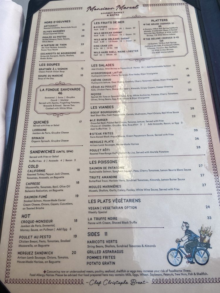 Introducing Monsieur Marcel Bistro: A French bistro located at 6333 W 3rd St Ste 150 Los Angeles, CA, offering a diverse menu of French cuisine, wine, and seafood. The restaurant provides a cozy atmosphere with amenities like outdoor seating, waiter service, and free Wi-Fi. Customers praise the fresh and delicious kale Caesar salad, oysters, and Alaskan Halibut, highlighting the quality of the food and the excellent service. The signature fondue is a must-try, along with the steamed clams in wine and garlic sauce. While some reviews mention the tight seating and expensive parking, guests appreciate the European vibes and gourmet offerings at the historic Farmers Market location. Overall, Monsieur Marcel Bistro is a go-to destination for a taste of France in LA.